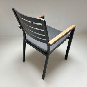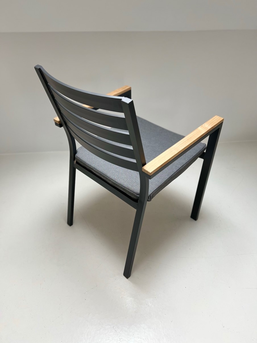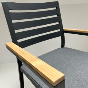 Alumínium kerti étkezőszék gunmetal színben Teak fa karfával, esztétikai hibákkal.